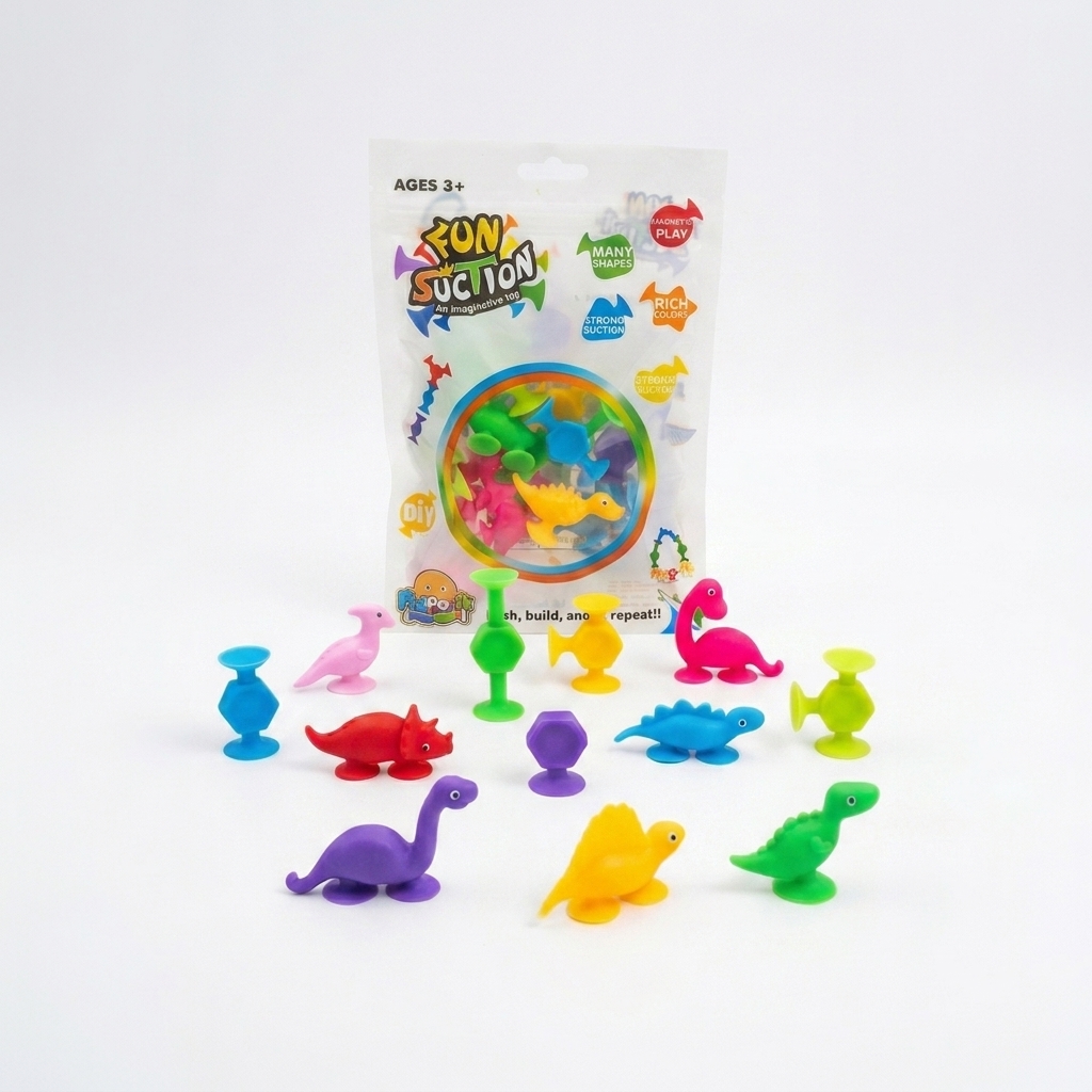 Um recurso divertido e cheio de possibilidades que combina 7 dinossauros de ventosa + 5 conectores em formatos variados, permitindo grudar em superfícies lisas, unir peças entre si e criar diferentes combinações.