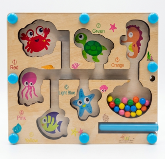 O Labirinto Magnético permite conduzir as bolinhas pelos percursos com o auxílio da caneta magnética, com o objetivo de levar cada bolinha até a cor correspondente.